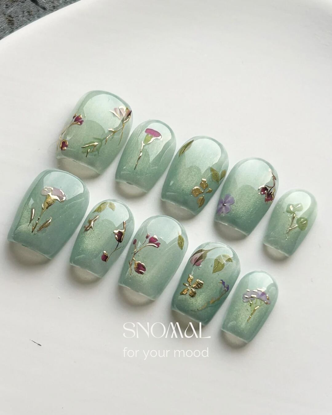 ふんわりくすんだエメラルドグリーンに、繊細な小花アートを散りばめた大人ナチュラルなデザイン。